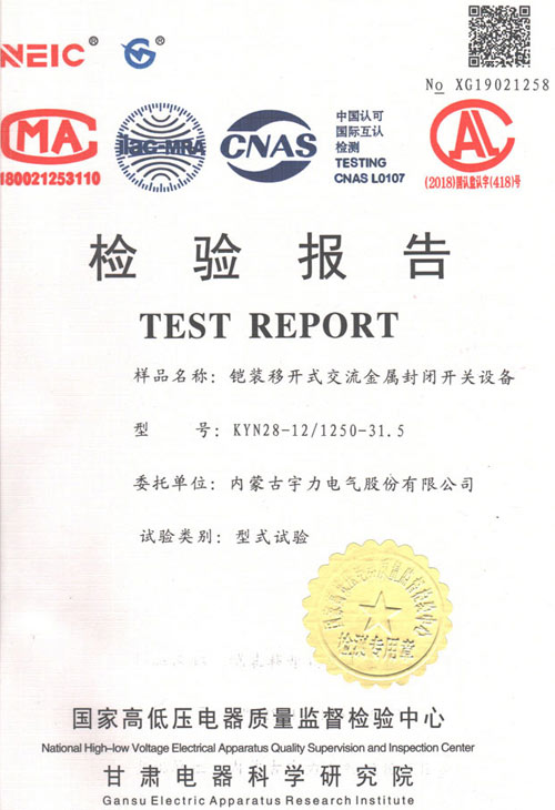 KYN28-12/1250-31.5中置式開(kāi)關(guān)柜(檢驗(yàn)報(bào)告)