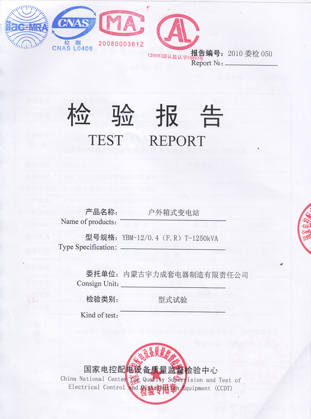 YBM-12/0.4戶(hù)外箱式變電站(檢驗(yàn)報(bào)告)