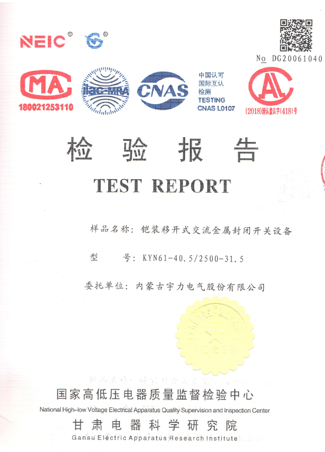 KYN61-40.5/2500-31.5鎧裝式開(kāi)關(guān)柜(檢驗(yàn)報(bào)告)